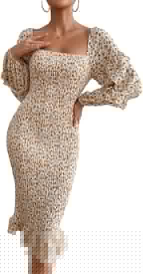 Women's Long Puff Sleeve Floral Midi Bodycon Dresses Square Neck Ruffle Mermaid Smocked Dress