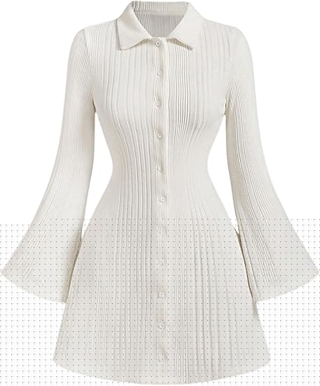 Women's Button Down Rib Knitted Mini Dress Long Bell Sleeve Flowy Dresses Fall Clothes