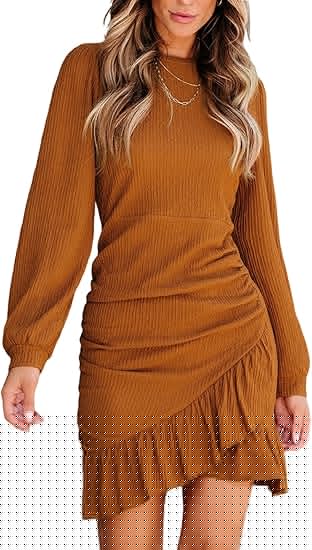 Women's Knit Ruched Mini Fall Dress Smocked Ruffle Hem Crew Neck Long Sleeve Bodycon Casual Summer Autumn Dresses