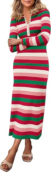 Women's Striped Sweater Dress Fall Long Sleeve Button Up V Neck Knit Midi Bodycon Party Dresses