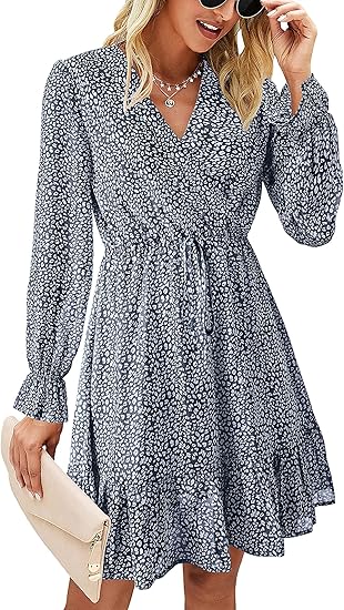 Women Casual Summer Fall Dresses Long Sleeve Floral Wrap V Neck High Waist Ruffle Tiered A Line Flowy Mini Dress