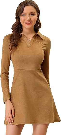 Women's Faux Suede Dress V Neck Long Sleeve Fall Winter A-Line Mini Dress
