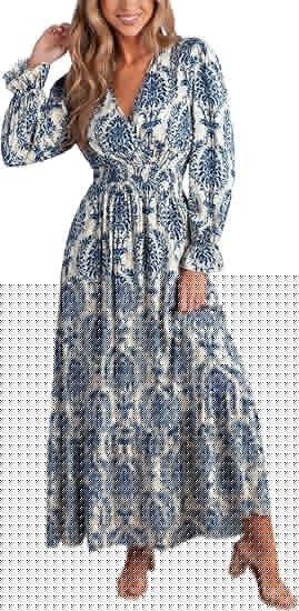 Maxi Dresses for Women V Neck Ruffled Long Sleeve Paisley Smocked Waist A Line Casual Fall Dress