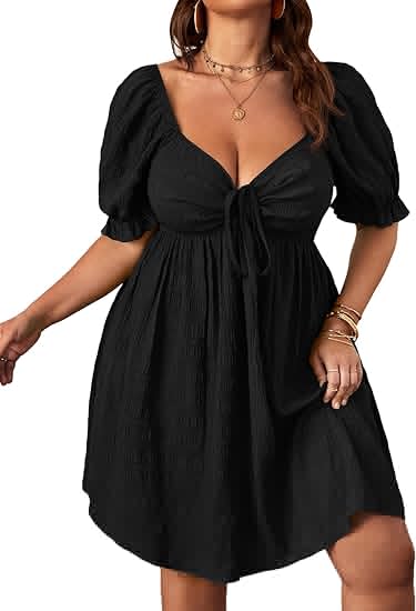 Womens Plus Size Summer Dresses Sweetheart Neck Puff Short Sleeve Tie Swing A Line Midi Dress